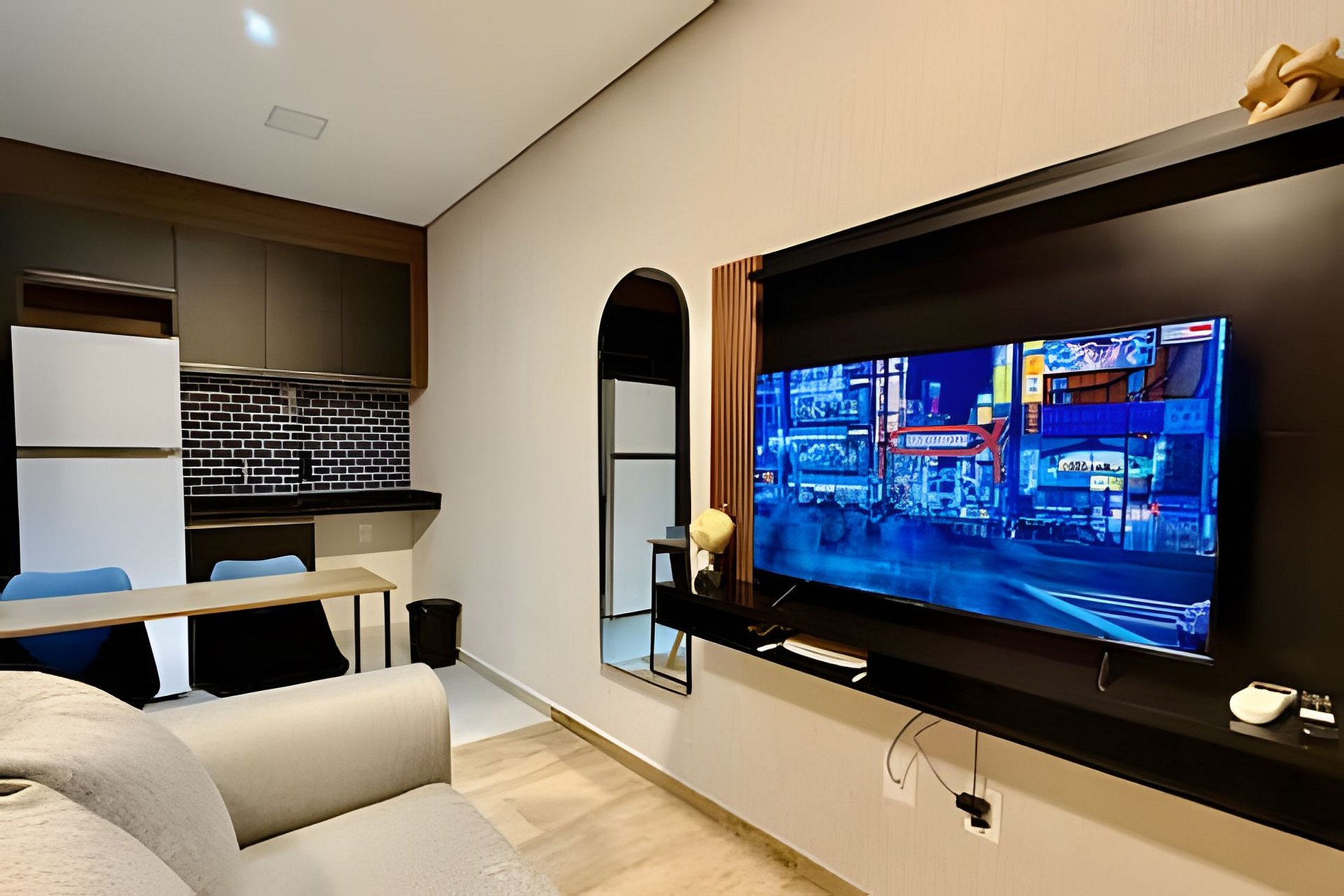 O ambiente é integrado e conta com Smart TV 43' e sofá. A cozinha é equipada com geladeira, cooktop, filtro de água, micro-ondas, utensílios e secador de cabelo. A torneira possui água quente, trazendo mais praticidade no dia a dia.