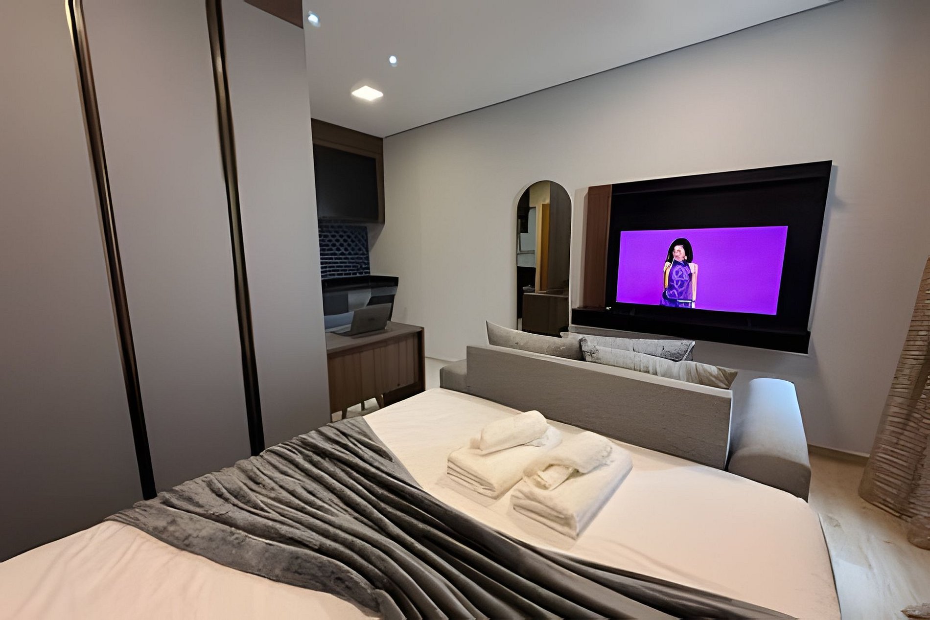 O studio dispõe de cama de casal, ar-condicionado e banheiro novo, pensado para garantir conforto e bem-estar durante a estadia. O acesso é prático e seguro, com self check-in por reconhecimento facial e fechadura eletrônica com senha.