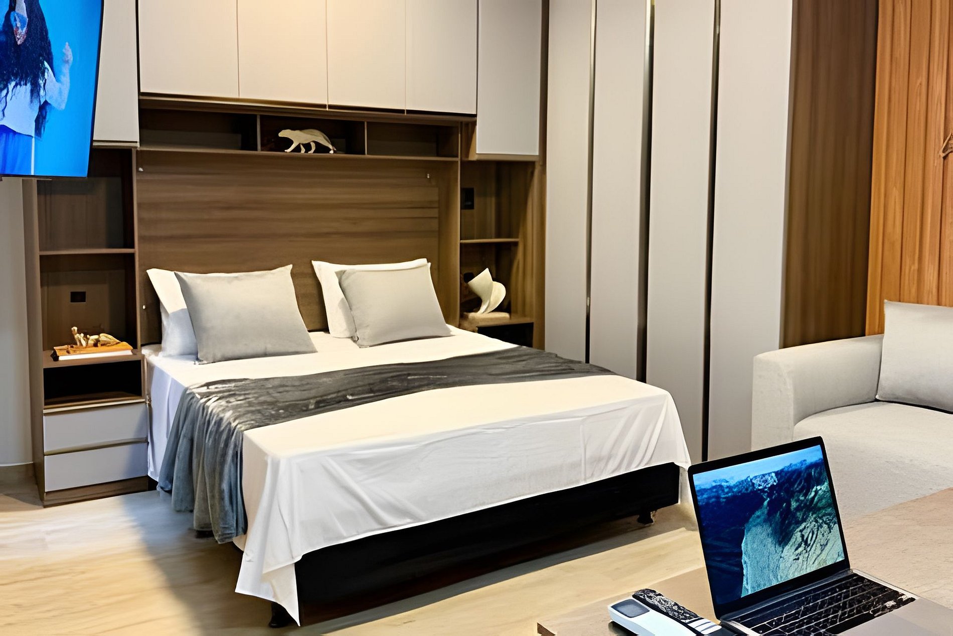 O studio conta com ar-condicionado quente e frio, Smart TV 43' e internet rápida, ideal tanto para lazer quanto para trabalho. A cama Queen possui enxoval de cama e banho padrão hotel. Também disponibilizamos secador de cabelo e ferro de passar.