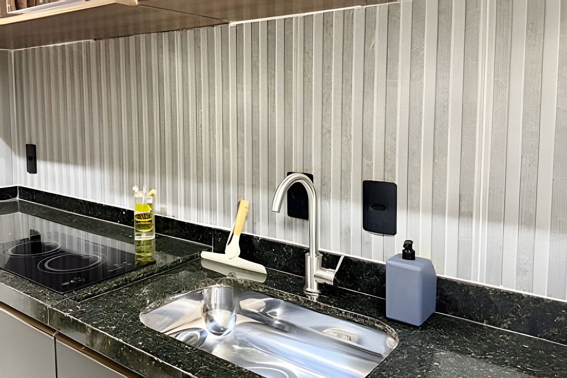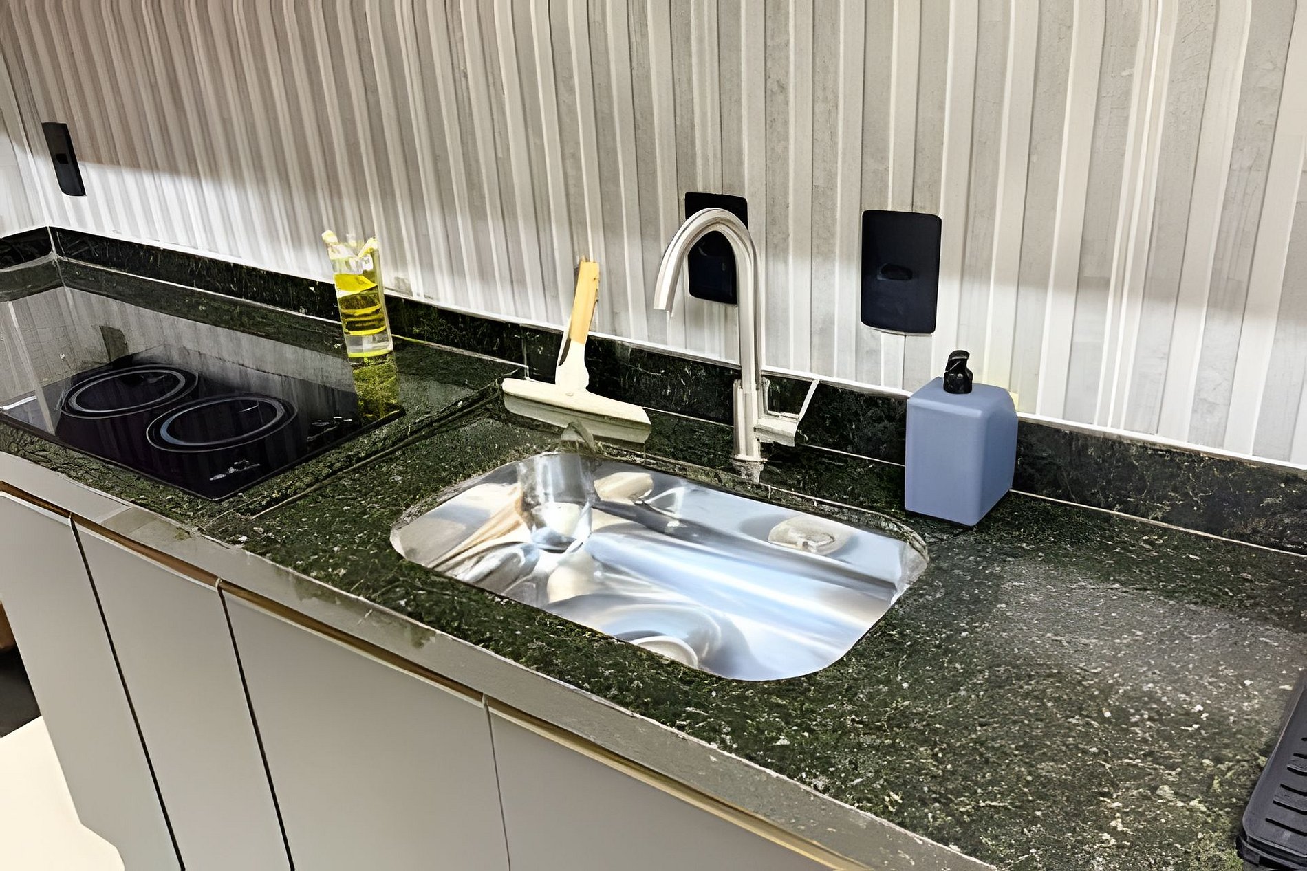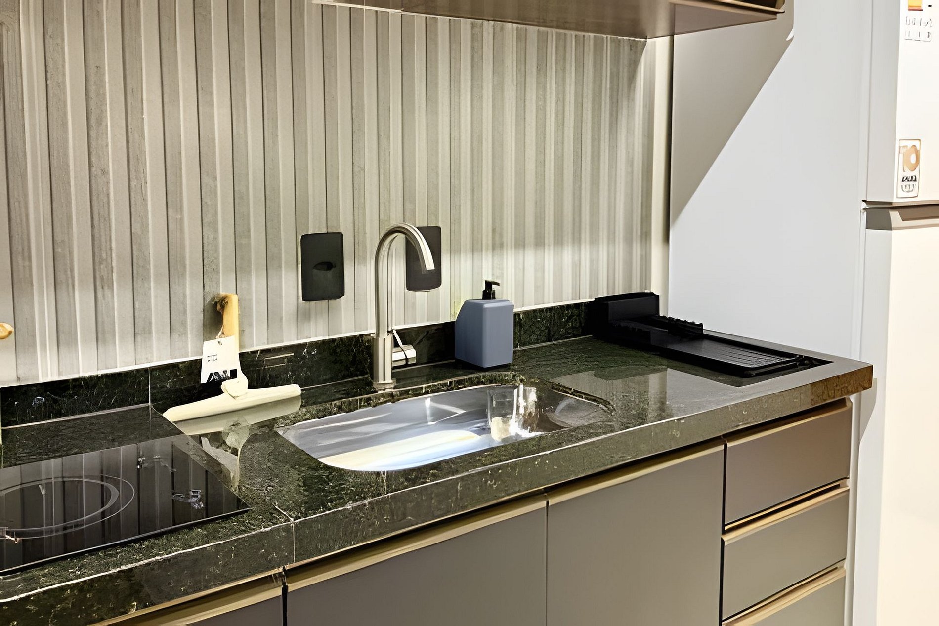 O ambiente é integrado e conta com Smart TV, mesa, e sofá. A cozinha é equipada com geladeira, cooktop, filtro de água, micro-ondas, utensílios e secador de cabelo. A torneira possui água quente, trazendo mais praticidade no dia a dia.
